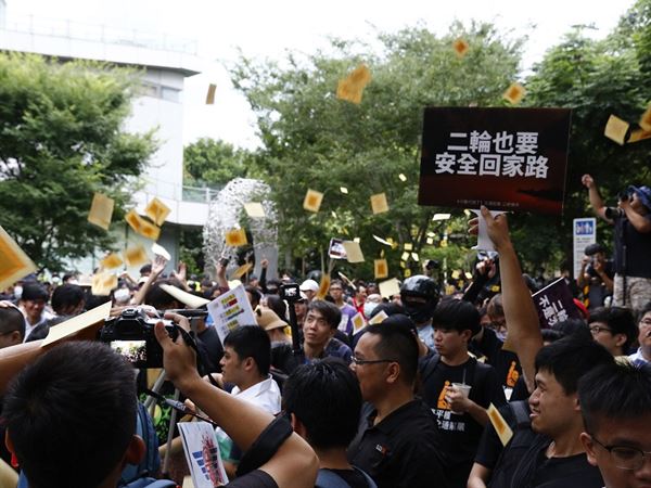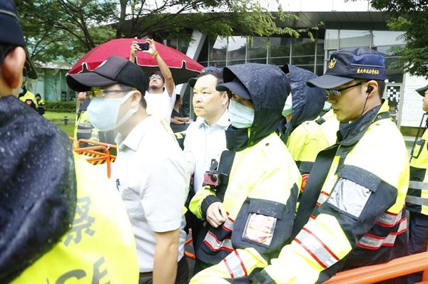 公路總局派出的代表在層層警力的包圍下終於出面與路權團體接觸