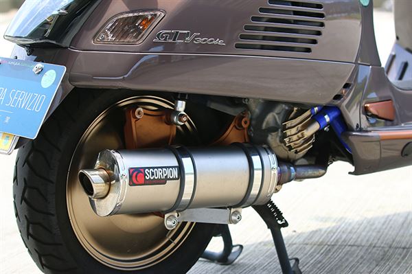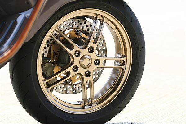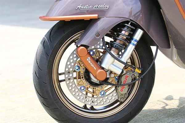 摩卡褐為紀念車款GTV中非常特殊的車色,在全車特殊烤漆處理的部分,運用了特殊多層次的烤漆以及按照車主騎乘習慣的改裝手法,娓娓道出屬於車子本身特殊的顏色。博朗茲的英文名稱其實就是古銅的意思,原排氣量278cc,我們讓它動力升級至300cc,跳脫了一般民眾想到偉士牌總是騎帥不騎快的想法,動力視覺效果十足,前後13吋的輪胎配置,也是目前全世界唯一能安裝(圓盾)後框樣式全封的Vespa,我們也增加了煞車方面的超強制動力,前後煞車 BREMBO總泵安裝,前後CNC卡鉗,以及260mm加大碟的配置,整體改裝過程須兼顧安全行駛的概念以及工藝美學,相當耗費心力。