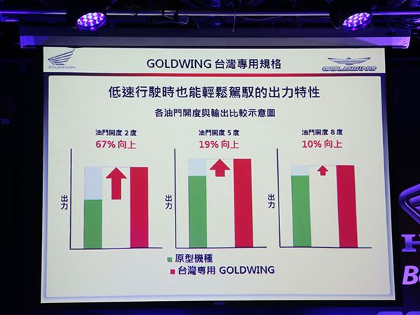這次由台灣本田引進的GOLDWING與其他版本有些微的差異,在油門開度的部分,特別為台灣的騎乘習慣做了調整,相較原型機種,相同的油門開度能提供更多的動力反應。因為台灣地狹人稠,同時考慮到GOLDWING龐大的車身體積與車重,利用這樣的設定,強化低速行駛時輕鬆獲得更適合的出力特性,以符合台灣道路的使用習慣,尤其在40-60 Km/h的常用區間,獲得較靈敏的動力反應。