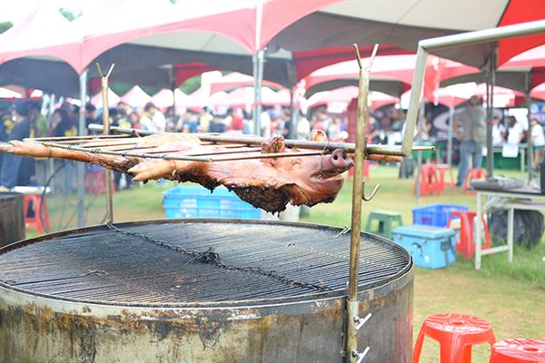 會場上的現烤乳豬肉,取用的排隊人潮當然爆滿。
