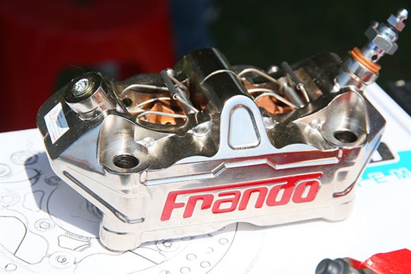 國內最知名的制動廠商:Frando,也參與了這場盛會,他們在會場上展示了以Racing車系為主的光陽車款套件,包括卡鉗、碟盤以及總泵。