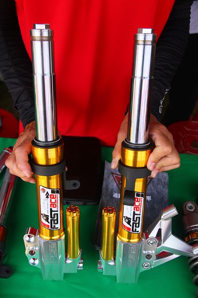 以越野車、腳踏車懸吊起家的法斯特,對於需要長行程來緩衝的前岔相當在行,當天也有相當多不同等級的懸吊部品展示。