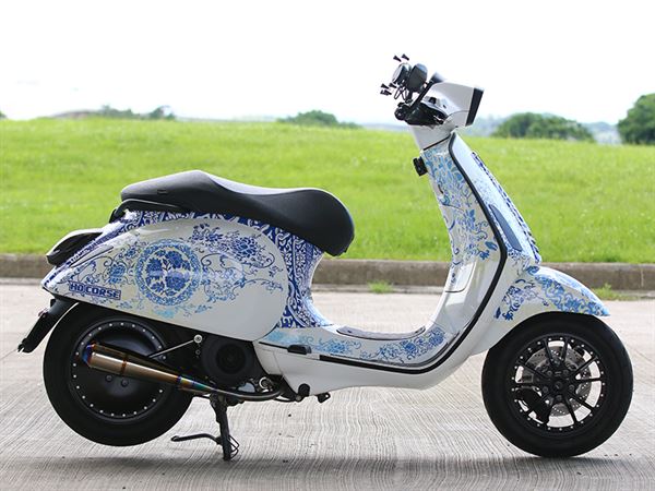 當來自東方的特有文化 青花瓷 遇上了來自西方的浪漫 Vespa會擦出什麼樣的火花呢?以中西合璧的構想打造出這台獨一 無二的美感。擺脫以往Vespa的固有改裝風格,將東方色彩融入的車色當中別有一番風味。除了外觀搶眼之外,全車的改裝飾品,不論是在車殼彩繪,排氣管,精緻的坐墊,車頭造型,以及後鼓煞車改成碟煞,全部都是Made in Taiwan全手工客製化打造而成,這是我們台灣最自豪的改裝創作、改車技術與加工 。玩車,不是一昧的模仿而是能夠跳脫傳統,打造出個人的獨特風格,玩車也可以很有品味。
