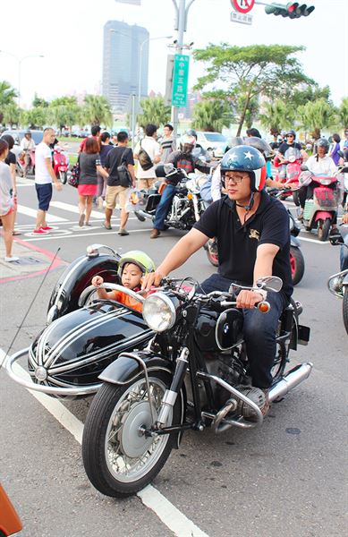 父子騎著老BMW加邊車一同遊街