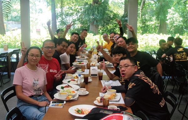 在夏末的後疫情時代,來自全台各地的隼友,齊聚彰化田尾著名的園藝庭園餐廳菁芳園,只見綠樹成蔭、花團錦簇,令人心曠神怡!車友停妥車輛,彼此寒喧問後,拍完會師大合照,再自行進入玻璃花房餐廳各自點餐吃飯。因為疫情緣故主辦人捨棄了吃合菜的用餐方式,畢竟還是要遵守防疫新生活的規定。席間也抽空發放今年的HAYABUSA紀念版T和紀念馬克杯。餐畢車友在廣大的庭園散步、談天或留影,可以自由的大口呼吸新鮮空氣,真是幸福!到了下午車友才解散回家,至於會師後要繼續環島行程的隼友們則一路南下,也歡迎中南部車友順路陪跑返鄉。