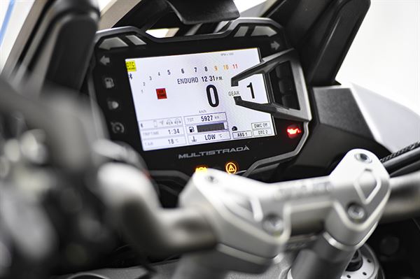 可以體驗最新電子裝置也是MULTISTRADA的一大魅力。騎乘時可以選擇將馬力抑制在100ps以下的「URBAN」、「ENDURO」模式,以及全動力輸出的「TORUING」、「SPORT」模式。除了引擎的輸出特性和循跡力控制系統之外,還有在行駛中不斷將緩衝力調整成最恰當的半自動電子懸吊系統等豐富的電子裝置可供設定和變更。