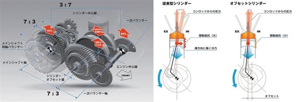 為減少引擎震動以雙平衡軸形式設置,另外為了減少活塞的摩擦阻力,以及盡量消除曲軸作動的無謂橫向力,而設計出偏移式曲軸達成目的