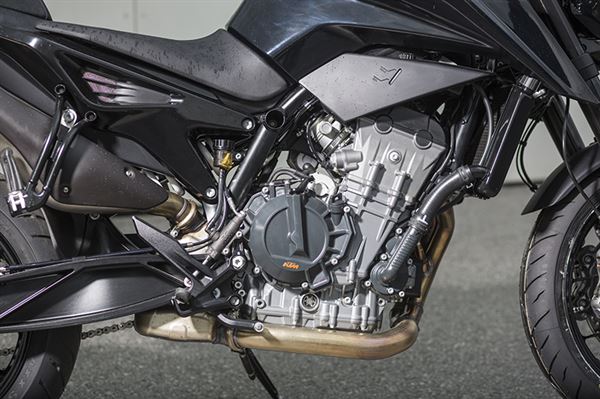 包覆在鋼管車架內的並列雙缸引擎,在駕馭時能使騎士有一種人車一體的騎乘感,在變向時也能給於最精準的操駕,另外還帶點運動風呢!在座高上的配置KTM選擇較為中置的高度,主要是配合各種身高的騎士去設計,這也達到了當時針對各族群的需求。KTM談到說這會是台具備高階配備的中量級機種,像是BOSCH ABS制動系統、WP全段可調倒立式前叉、WP轉向阻尼、中置單槍後避震和2-1排管等。輪組部分則配上10輻射輕型鋁合金輪框。 前後LED燈組和車獨特的頭燈造型,儀表則配上TFT全彩式,這倒是跟690 Duke有些相似,不過790版的則會搭載可調式背光功能。