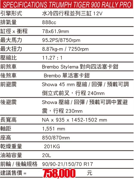 於此同時,從上世紀90年代誕生至今的TIGER老虎車系作為這家英倫車廠在ADV領域的代表已有將近三十年的歷史。今天所試乘的TIGER 900 RALLY PRO,擅長的領域不僅偏離了充滿文化氣息的街頭及鋪裝平整的熱血賽道,硬派外表下集結了時下最新的電控科技與舒適配備,在國內逐漸受到買家關注的ADV領域當中,以冠上”PRO”之名的頂級版本撼動騎士們的三觀。