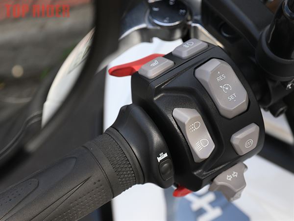 功能豐富的左把手總成除了一般的喇叭與燈系切換功能外,更具備加熱握把開關、定速巡航調整鈕、騎乘模式切換按鍵與最下方的五向選單搖桿,前端在遠燈開關的上方還有加熱坐墊與霧燈的開關按鈕;右側把手則是三合一式斷電開關、雙黃燈開關以及主選單按鈕。