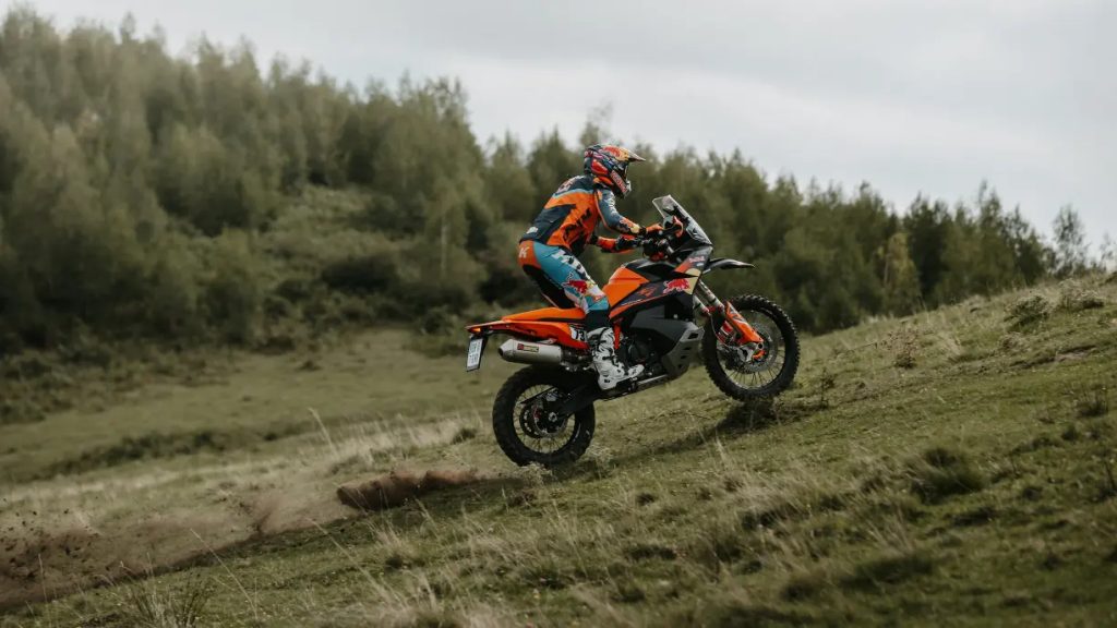 為了對應極端的越野環境,這台賽車配備了高強度的 EXCEL 鋁合金鋼絲框,尺寸為前 21 吋與後 18 吋的競技標準 。動力核心則是排氣量 889cc 的並列雙缸引擎,可輸出 105 PS 最大馬力與 100 Nm 扭力,並標配輕量化的 AKRAPOVIC 鈦合金排氣管,讓動力反應更為靈敏 。在電控系統方面,KTM 直接提供了完整的 TECH PACK 套件,包含可微調循跡介入的 Rally 模式、進退檔快排系統、定速巡航以及 MSR 引擎阻力調節系統,騎士能透過 5 吋 TFT 全彩儀表輕鬆調整各項設定 。